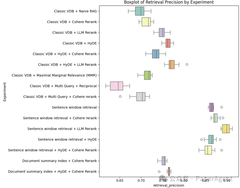 使用LLM重排序(LLM Rerank)和假设文档嵌入(HyDE)的技术显示出提高的精度,显著优于朴素RAG(Naive RAG)基线。相反,最大边际相关性(MMR)和Cohere重排序并没有表现出明显的优势,它们的中位数精度得分与基线相当或更低。