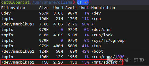 ingFang SC", "Microsoft YaHei", sans-serif;font-size: 14px;letter-spacing: normal;text-wrap: wrap;background-color: rgb(255, 255, 255);">由于板载仅8G存储空间,Ollama模型下载、解压需至少预留两倍模型文件大小的空间,因此我希望将模型文件存放在SD卡路径上。