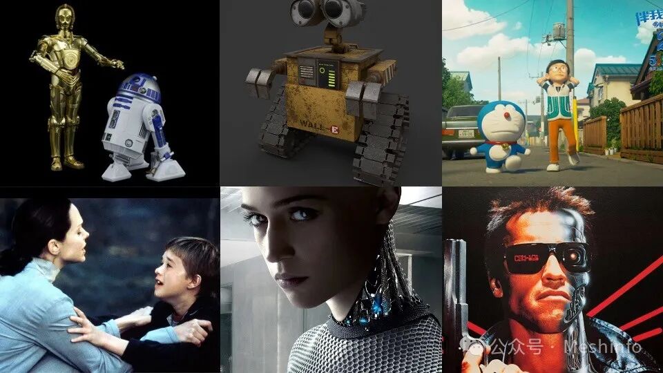 星球大战中的3PO和R2D2,负责清理垃圾的瓦力,没有手指头但是无所不能的哆啦A梦,片名就叫《AI》中的不幸患病离世的小男孩的替身David,机械姬中的Eva和著名的终结者。