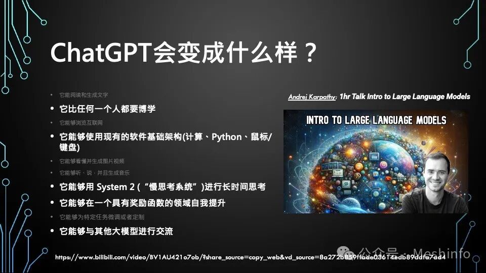 你已经大致知道了ChatGPT是如何制造出来的,而且大概率也体会过他的强大。那么他将来会变得怎么样?ChatGPT的制造者之一Andrej Karpathy给出了自己的预言:Andrej Karpathy 的这段预言描述了大型语言模型(LLMs)未来可能具备的一系列先进能力。我们可以逐点理解这些预测: