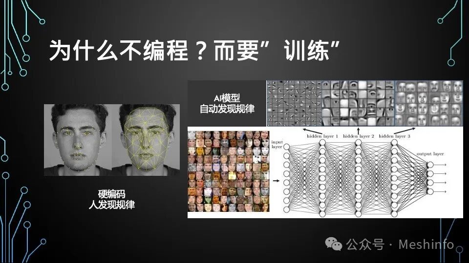 可能你会觉得奇怪,训练看上去是一个很困难的过程,我们是不是可以编写一段代码,利用各种逻辑判断来识别手写数字或者是控制小车。为什么要用训练AI模型这种看上去效率不太高的方式?我们以人脸识别为例来说明,人脸之间的不同主要有眼睛大小,眉毛粗细,鼻梁高低等等。如果我们需要通过编程方式来识别人脸,就需要实现知道人脸的这些特征,并且编程让计算机去找到这些特征,从而识别出特点的人。如果人脸的数量不太多,而且这些人长得差别比较大,那么这种方式是可行的。但是如果我们需要实现成千上万的人脸识别,那么编程的方式就比较困难了。因为你很难发现一套规则,来区分那么多的人脸。但是如果采取训练一个AI模型的方式,那么模型就能自动的找出一套规律,来区分哪怕是非常细微的人脸之间的差别。如果我们已经事先知道规则,硬编码的方式当然很有效率,但是如果我们不知道规则,而希望去发现它,那么训练就是比较有效的。可以开始讲ChatGPT了