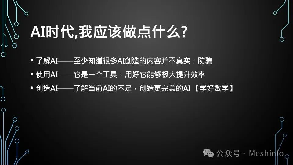 AI对人类的影响应该是长远的,可以参考互联网深刻的改变了我们的生活。所以你应该了解它、使用它。如果更有追求一些,你应该思考如何创造一个更好的AI。