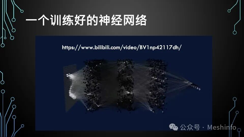 这个视频比较直观展示了AI模型工作的过程。这个模型是一个比较简单的手写体识别的模型,它能够识别手写的0~9的数字。这个AI模型有很多已经连接好的神经元,他们之间的连接的粗细(参数)已经训练过。假设一个手写数字是比较明亮的部分,当一个手写体数字被输入到模型当中时,某些神经元受到的刺激超过了阈值(比较亮的点),那么它就会把这个刺激往下传导,到最后有10个神经元,代表是0~9这10个数字,如果最终这些神经元亮了(被激活),那么就表示输入的手写体是对应的数字。