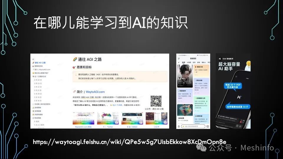 飞书上有人整理了当前很多AI内容,是一个很好的参考工具。例如B站和油管也有很多学习材料。另外,如果你访问ChatGPT有困难,国内也有很多非常不错的AI,例如智谱清言和Kimi助手。