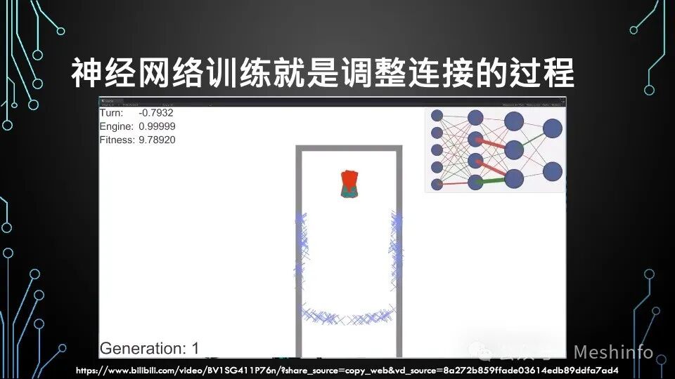 最终能够跑出隧道的小车的AI模型,它的神经元之间的连接具有了"正确"的粗细,这个大脑在当前的任务中,能够正常工作。