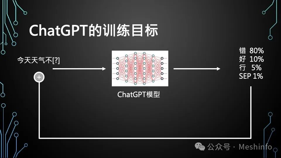 我们一开始先设定ChatGPT的训练目标,就是根据输入的文本"预测下一个字",俗称接龙。这也是ChatGPT所有能力的来源。为什么能够正确的预测下一个字具有这么强大的能力呢?想象一下你看一本侦探小说,当你看了前面的章节之后,突然一个灵光闪现,凶手就是XXX!这其实就是思考的结果。所以能够根据输入来预测下一个字就是智能!这也是人们长期研究语言得到的一个结论。ChatGPT的训练过程和其他AI没有不同,都是: