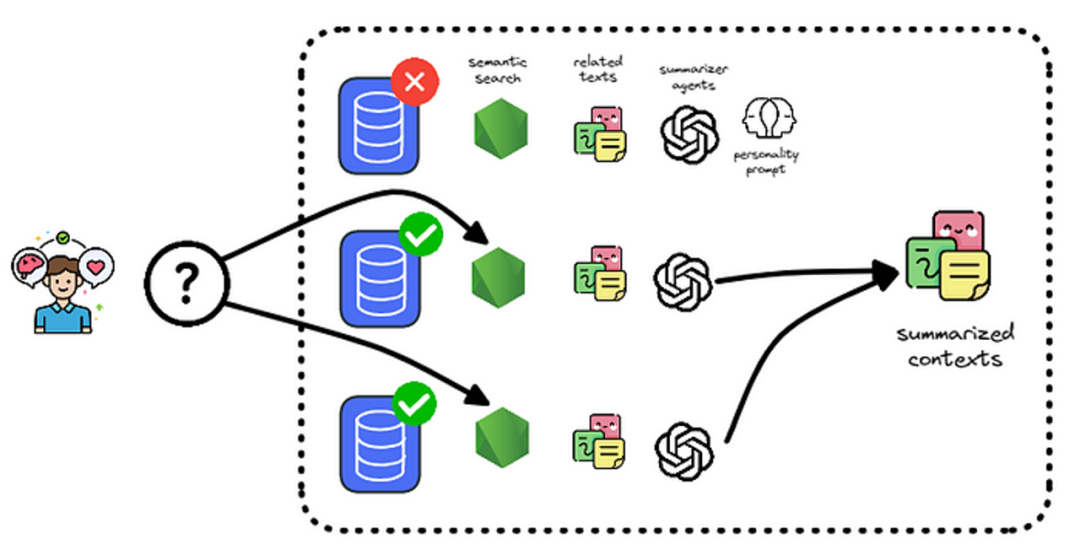 然后,这些摘要代理将语义搜索中提取的文本片段与原始问题输入进行汇总,就好像代理本身在回答问题一样!