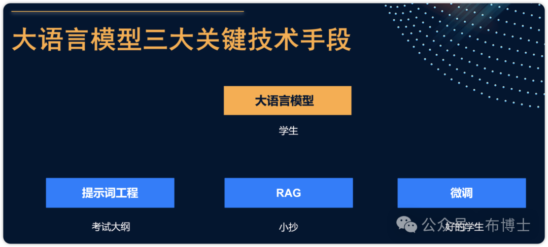 在大语言模型的开发和应用中,Prompt工程、检索增强生成(Retrieval-Augmented Generation, RAG)和模型微调是三种关键技术。为了更好地理解这些技术的作用和相互之间的关系,我们可以通过一个贴近生活的比喻来进行阐述:将大语言模型比作参加考试的学生,如下图所示(从小到大我最怕的一件事情就是考试,以至于到现在每每精神压力比较大的时候,晚上做噩梦都是梦到自己在考场上,几十年来一直如此):