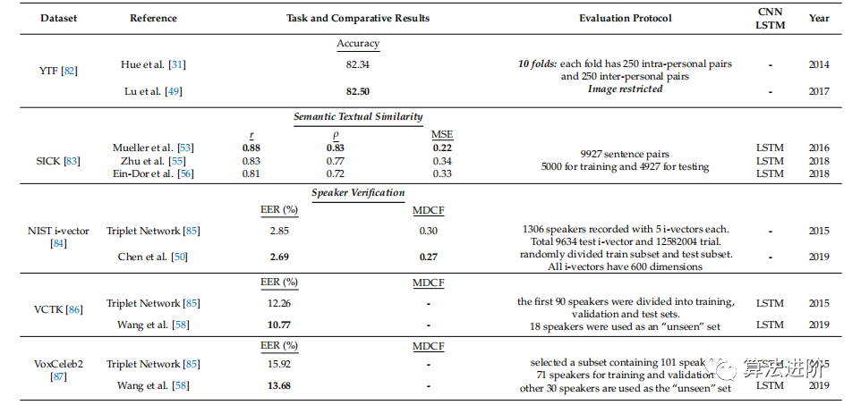 在训练阶段之前,必须为Siamese、Triplet和n-double网络准备训练数据,此过程需要更多磁盘空间并且非常耗时。宋等人提出了一种新的深度度量学习方法,使用聚类损失将样本聚集在一个聚类中(图 6g),防止不同的簇相互接近。里佩尔等人强调三元组损失一次评估一个三元组样本来训练数据集,减少网络的学习时间。然而,这种方法会导致性能不佳和培训不足。因此,他们建议磁体损失,这会惩罚簇重叠并评估簇中最近的邻居以分离多个簇。所提出的方法具有局部区分度,并且与优化过程全局一致。混合损失受到三元组损失的启发,除了anchor和负样本之外,还使用三个正样本和三个负样本来建立样本之间的相似关系。图6h说明了在使用局部邻域时相似样本如何接近最近的集群。表2详细总结了文献中最先进的损失指标。