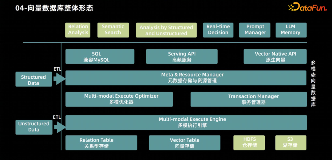 上图左侧是数据的来源,有各种各样多模态的数据类型。从上往下看,最上面是我们通过向量数据库实现的一些场景,包括关系数据分析、语义数据检索、实时决策、提示词管理和大模型记忆的管理。下面展示了各种各样的服务形态,包括兼容MySQL 协议、提供 Serving API 的对接、面向原生向量的 API。再往下是向量数据库所要具备的元数据存储与资源管理能力,以及一些优化的组件,比如多模优化器和事务管理器,用来保证向量数据库高效地运行。最底层是数据存储的形态,有关系型存储、向量存储以及 HDFS 仓存储和湖存储。