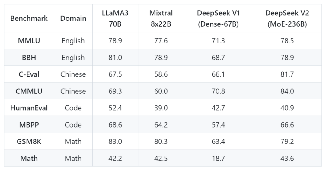 下面是 DeepSeek-V2 与 LLaMA 3 70B、Mixtral 8x22B、DeepSeek V1 (Dense-67B) 对比结果: