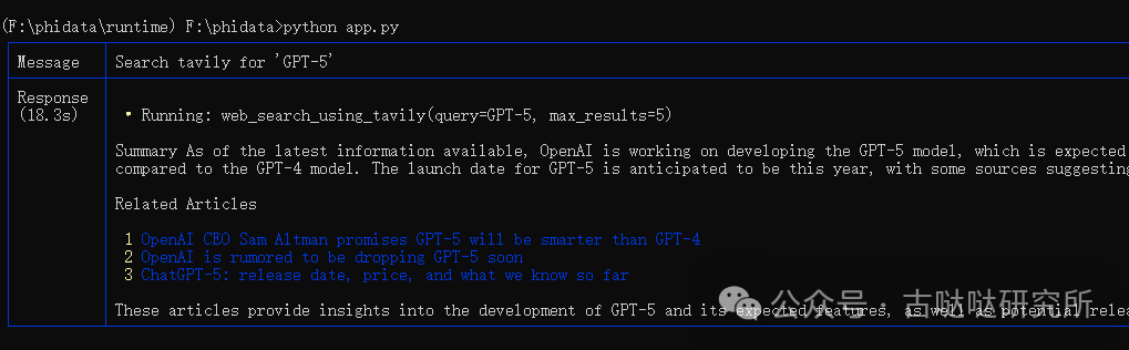 窗口返回了查询结果,一段GPT-5的介绍和几个相关的网页链接,这就为Llama3提供了实时联网过去最新信息的能力。框架提供多种联网查询的工具这里就不每个介绍了,有兴趣的可以看项目文档,功能十分丰富,三天三夜讲不完。