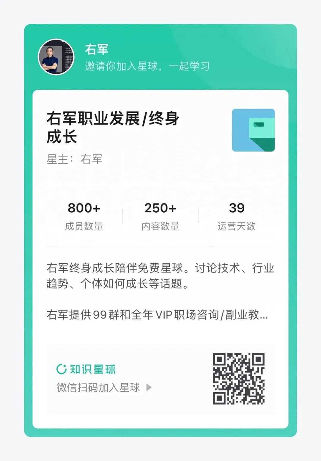 右军终身成长陪伴免费星球,讨论技术、行业趋势、个体成长等话题,快来扫码加入星球一起吧。