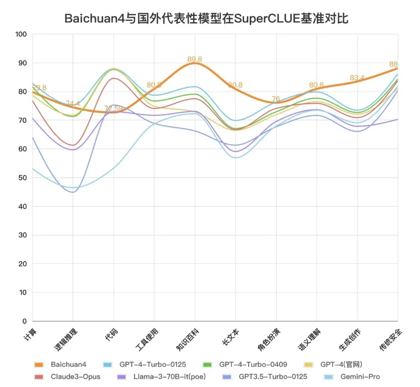 相较于上一代模型,Baichuan 4不仅在通用能力上有显著提升,还特别加强了数学和代码能力。这使得Baichuan 4在国内外评测中均表现出色,尤其在SuperCLUE的评测中脱颖而出,获得了国内第一的佳绩。此外,Baichuan 4在知识百科、长文本处理和生成创作等中文任务上表现尤为突出,明显优于国外的主流模型。