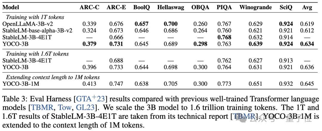 在LM Eval Harness的多个下游任务上,YOCO与Transformer模型OpenLLaMA-3B-v2、StableLM-base-alpha-3B-v2、StableLM-3B-4E1T打得有来有回。