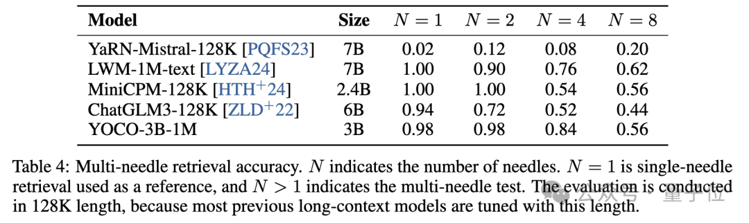 在多针检索任务上,YOCO-3B-1M的性能优于一些超3B的Transformer模型: