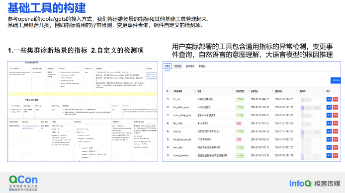 我们实现了一个变更事件查询工具,当出现故障时,用户可以通过调用这个接口来确定是否由线上变更导致。我们在平台上部署的组件配置了一些工具,例如异常检测、变更和事件查询等,还包括了自然语言的意图理解和大语言模型的根因推理功能。