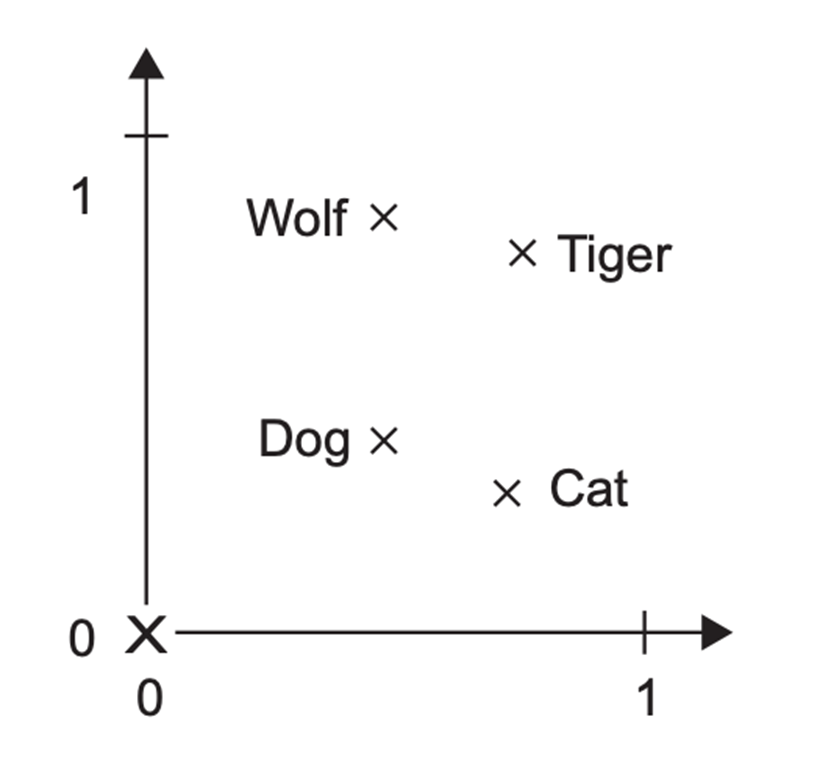 图示:一个二维嵌入空间,使得将“狼”与“狗”链接的向量与将“虎”与“猫”链接的向量相同。