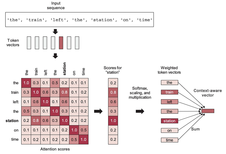 自我注意力是如何工作的:在这里,注意力分数是在“站”和序列中的所有其他单词之间计算的,然后它们被用来加权成为新的“站”向量的词向量的总和。