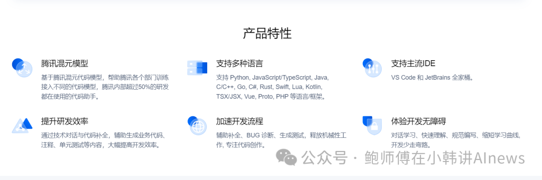 • 加速开发流程:辅助补全、BUG 诊断、生成测试,释放机械性工作,专注代码创作。