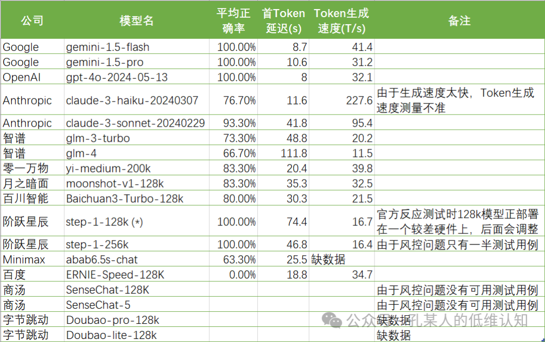 在本文发布前,阶跃星辰的同学反馈我测试step-1-128k时候它们模型正好放在低配置集群上,所以又再补充了step-1-256k的结果。后续阶跃星辰还会再调整不同模型的硬件配置安排。