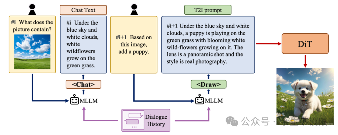 理解自然语言指令并与用户进行多轮交互对于文本转图像系统非常重要。它可以帮助构建一个动态且可迭代的创作过程,逐步将用户的想法变为现实。在本节中,我们将详细介绍如何赋予 Hunyuan-DiT 进行多轮对话和图像生成的能力。我们训练 MLLM 理解多轮用户对话并输出用于图像生成的新文本提示。