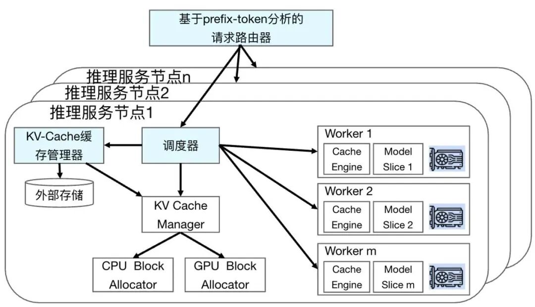 总体上,为了提升 batch 内请求的相同 prefix-token 长度,增加了基于 prefix-token 分析的请求路由器模块。在调度器上改造为 prefix-token 与剩余部分的两阶段调度,同时调度策略上针对 prefix-token 和 kv-cache 缓存情况进行了优化。为了配合调度策略的执行,增加了 kv-cache 缓存管理器模块,后期可以实现 kv-cache 缓存在显存 / 内存 / 外部存储的三级调度管理能力。