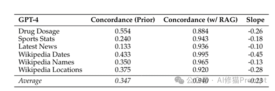 ingFang SC", "Hiragino Sans GB", "Microsoft YaHei UI", "Microsoft YaHei", Arial, sans-serif; background-color: rgb(255, 255, 255); font-size: 22px; letter-spacing: 0.578px; line-height: 1.4; border-width: 0px; border-style: none; border-color: initial; z-index: 0; visibility: visible; max-inline-size: 100%;">但更值得关注的是Slope这一列,它量化了模型先验概率每提高10%时,RAG采纳率相应下降的百分比。药物剂量数据集的Slope为-0.26,意味着先验概率每增加10%,RAG采纳率就下降2.6%。而维基百科日期数据集的Slope高达-0.45,表明该领域内模型更倾向于坚持自己的判断。