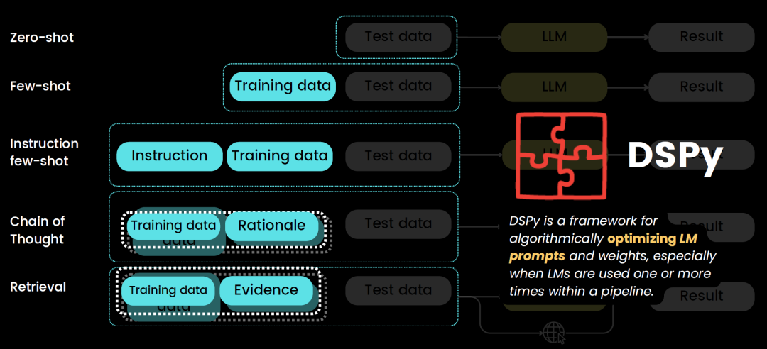 DSPy有两个特点,其一,它闭环了提示词工程。它将提示词工程从通常的手动和人工的过程转变为结构化、定义明确的机器学习工作流程(这个流程包括准备数据集、定义模型、训练、评估和测试)。这应该是最具革命性的方面。下图应该很形象地将这段文字表达了出来。
