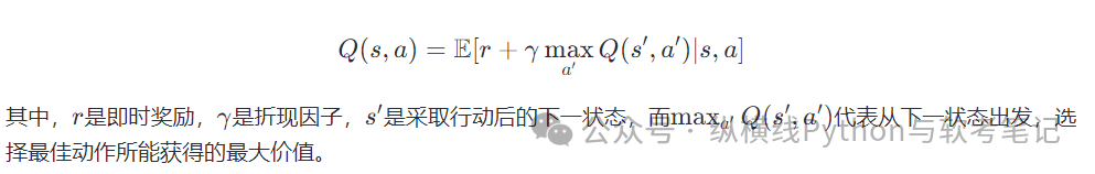 Q-Learning是一种无模型的强化学习方法,其核心在于学习一个动作价值函数Q(s,a),表示在状态s下采取动作a后预期获得的总回报。贝尔曼方程是其理论基础,体现了当前价值与未来价值之间的关系,即: