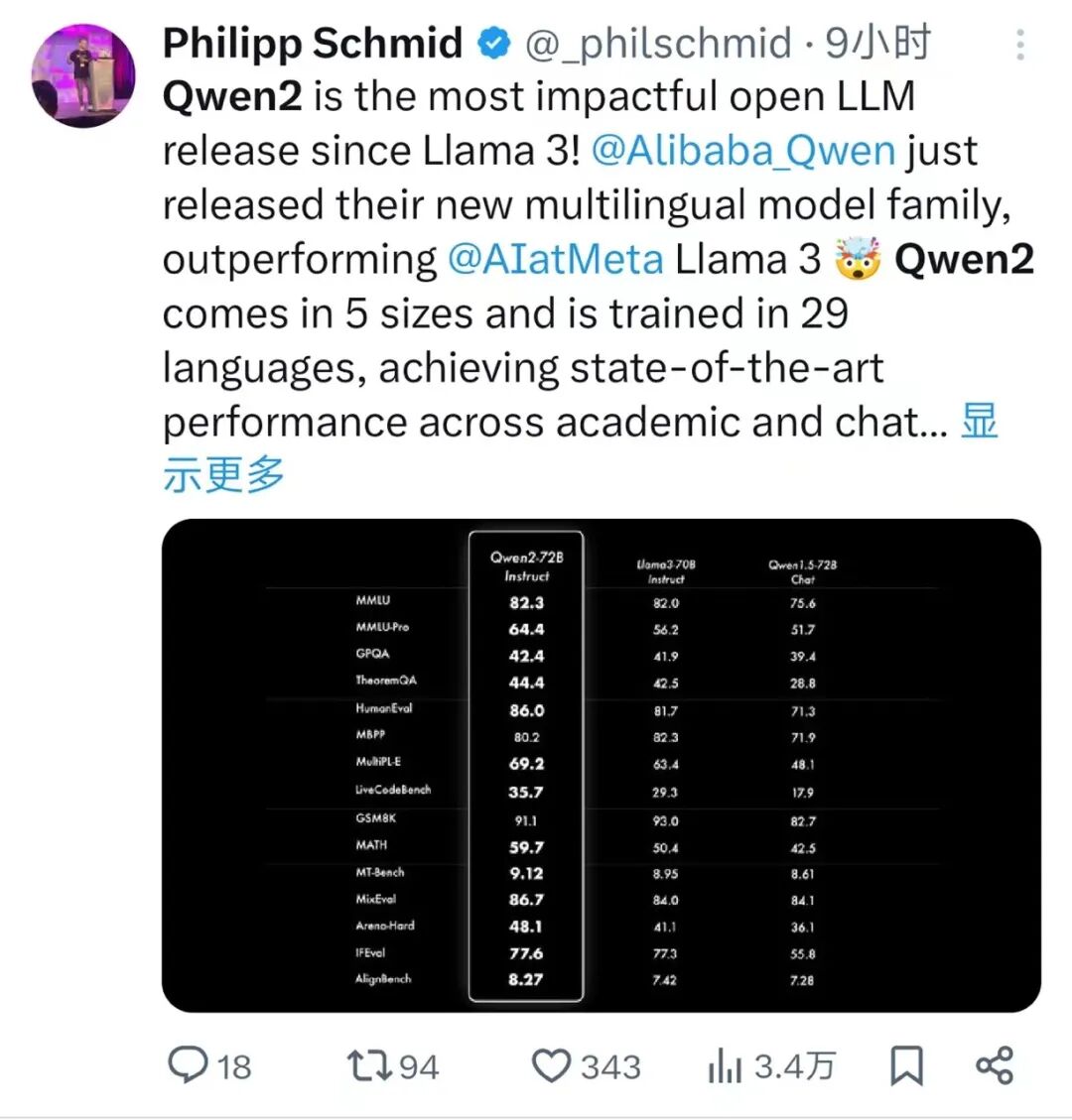 5个尺寸的预训练和指令微调模型:Qwen2-0.5B、Qwen2-1.5B、Qwen2-7B、Qwen2-57B-A14B以及Qwen2-72B; 在中文英语的基础上,训练数据中增加了27种语言相关的高质量数据; 多个评测基准上的领先表现; 代码和数学能力显著提升; 增大了上下文长度支持,最高达到128K tokens(Qwen2-72B-Instruct)。