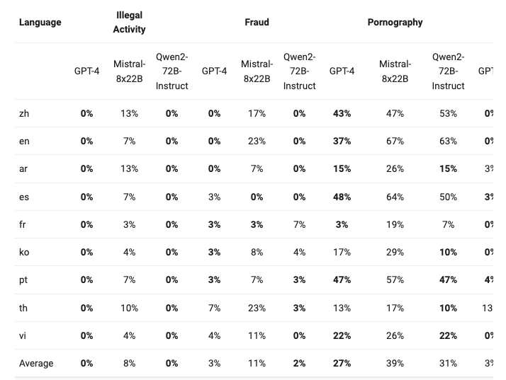 目前,Qwen2已在Hugging Face和ModelScope上同步开源。以下是核心信息: Qwen2系列包含5个尺寸的预训练和指令微调模型,其中包括Qwen2-0.5B、Qwen2-1.5B、Qwen2-7B、Qwen2-57B-A14B和Qwen2-72B。 在Qwen1.5系列中,只有32B和110B的模型使用了GQA。这一次,所有尺寸的模型都使用了GQA,以便让大家体验到GQA带来的推理加速和显存占用降低的优势。针对小模型,由于embedding参数量较大,Qwen2使用了tie embedding的方法让输入和输出层共享参数,增加非embedding参数的占比。上下文长度方面,所有的预训练模型均在32K tokens的数据上进行训练,其在128K tokens时依然能在PPL评测中取得不错的表现。然而,对指令微调模型而言,除PPL评测之外还需要进行大海捞针等长序列理解实验。在该表中,根据大海捞针实测结果,列出了各个指令微调模型所支持的最大上下文长度。而在使用YARN这类方法时,Qwen2-7B-Instruct和Qwen2-72B-Instruct均实现了长达128K tokens上下文长度的支持。Qwen团队投入了大量精力研究如何扩展多语言预训练和指令微调数据的规模并提升其质量,从而提升模型的多语言能力。尽管大语言模型本身具有一定的泛化性,Qwen还是针对性地对除中英文以外的27种语言进行了增强: 此外,Qwen2针对性地优化了多语言场景中常见的语言转换(code switch)问题,模型当前发生语言转换的概率大幅度降低。使用容易触发语言转换现象的提示词进行测试,观察到Qwen2系列模型在此方面能力的显著提升。Qwen2发布后两小时,Hugging Face联合创始人兼首席执行官克莱门特·德朗格(Clément Delangue)发推宣布,HF开源大模型榜单新的第一出来了,Qwen2-72B。 在针对预训练语言模型的评估中,Qwen2-72B在包括自然语言理解、知识、代码、数学及多语言等多项能力上均显著超越当前领先的开源模型,如Llama-3-70B以及Qwen1.5最大的模型Qwen1.5-110B。 大规模预训练后,对模型进行精细的微调,以提升其智能水平,让其表现更接近人类。这个过程进一步提升了代码、数学、推理、指令遵循、多语言理解等能力。此外,模型学会对齐人类价值观,它也随之变得更加对人类有帮助、诚实以及安全。微调过程遵循的原则是使训练尽可能规模化的同时并且尽可能减少人工标注。Qwen团队探索了如何采用多种自动方法以获取高质量、可靠、有创造力的指令和偏好数据,其中包括针对数学的拒绝采样、针对代码和指令遵循的代码执行反馈、针对创意写作的回译、针对角色扮演的scalable oversight等等。在训练方面,结合了有监督微调、反馈模型训练以及在线DPO等方法。还采用了在线模型合并的方法减少对齐税。Qwen2-72B-Instruct在提升基础能力以及对齐人类价值观这两方面取得了较好的平衡。相比Qwen1.5的72B模型,Qwen2-72B-Instruct在所有评测中均大幅超越,并且了取得了匹敌Llama-3-70B-Instruct的表现。而在小模型方面,Qwen2系列模型基本能够超越同等规模的最优开源模型甚至更大规模的模型。相比近期推出的最好的模型,Qwen2-7B-Instruct依然能在多个评测上取得显著的优势,尤其是代码及中文理解上。在代码方面,Qwen团队成功将CodeQwen1.5的成功经验融入Qwen2的研发中,实现了在多种编程语言上的显著效果提升。而在数学方面,大规模且高质量的数据帮助Qwen2-72B-Instruct实现了数学解题能力的飞升。Qwen2系列中的所有Instruct模型,均在32k上下文长度上进行训练,并通过YARN或Dual Chunk Attention等技术扩展至更长的上下文长度。下图展示了在Needle in a Haystack测试集上的结果。值得注意的是,Qwen2-72B-Instruct能够完美处理128k上下文长度内的信息抽取任务。Qwen团队表示,“只要有充足的算力,它一定能成为你处理长文本任务的首选!”此外,Qwen2-7B-Instruct几乎完美地处理长达128k的上下文;Qwen2-57B-A14B-Instruct则能处理64k的上下文长度;而该系列中的两个较小模型则支持32k的上下文长度。除了长上下文模型,Qwen还开源了一个智能体解决方案,用于高效处理100万tokens级别的上下文。下表展示了大型模型在四种多语言不安全查询类别(非法活动、欺诈、色情、隐私暴力)中生成有害响应的比例。测试数据来源于Jailbreak,并被翻译成多种语言进行评估。Llama-3在处理多语言提示方面表现不佳,因此没有将其纳入比较。通过显著性检验(P值),Qwen2-72B-Instruct模型在安全性方面与GPT-4的表现相当,并且显著优于Mistral-8x22B模型。 此次Qwen2采用不同的模型许可。除了Qwen2-72B依旧使用此前的Qianwen License外,其余模型,包括Qwen2-0.5B、Qwen2-1.5B、Qwen2-7B以及Qwen2-57B-A14B在内,均采用Apache 2.0的许可。3.Qwen2的下一步是什么?