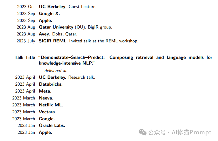 ingFang SC", "Hiragino Sans GB", "Microsoft YaHei UI", "Microsoft YaHei", Arial, sans-serif; white-space: normal; background-color: rgb(255, 255, 255); outline: 0px; letter-spacing: 0.578px; font-size: 22px; line-height: 1.4; border-width: 0px; border-style: none; border-color: initial; z-index: 0; visibility: visible; max-inline-size: 100%;">Omar Khattab目前是斯坦福大学的博士候选人(2024年6月毕业),2019年Omar毕业于卡梅隆大学计算机科学专业,目前也是AI/ML的Apple博士学者。他构建了检索模型以及基于检索的NLP系统,这些系统可以利用大型文本集合来高效透明地制作知识丰富的响应。Omar是ColBERT检索模型的作者,该模型是神经检索领域发展的核心,也是ColBERT-QA和Baleen等几个衍生NLP系统的作者。他最近的工作包括使用语言模型(LM)和检索模型(RM)解决高级任务的DSPy框架,以下是他近半年的会议演讲主题。
