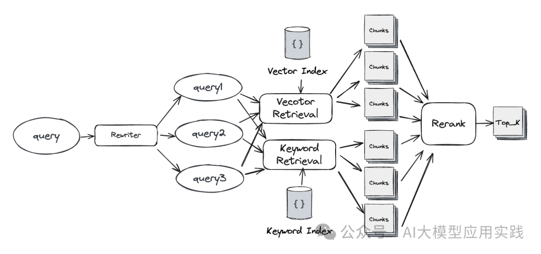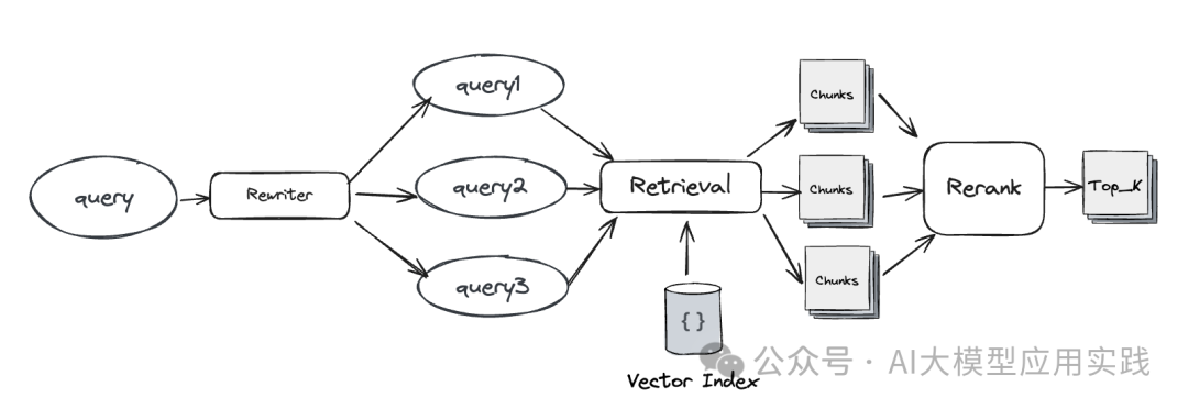 借助查询重写(或查询转换器)对输入问题进行扩展,生成多个不同表达形式或不同角度细化的输入问题,并对每个问题分别进行检索,然后对召回的知识块chunks通过重排(reranker)模块进行重新排序,并取最终的top_K用于后续生成环节。
