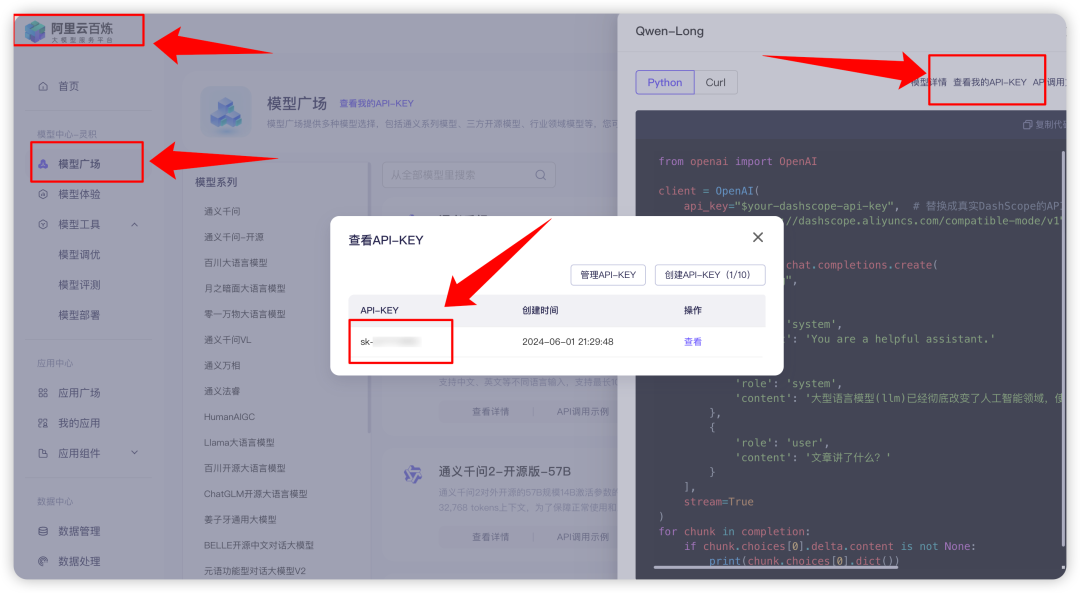 我们需要通过阿里云百炼平台获取大模型API,因为我要构建一个文档对话应用,所以这里我选用的是Qwen-Long这个大模型,Qwen-Long是在通义千问针对超长上下文处理场景的大语言模型,支持最长1000万tokens(约1500万字或1.5万页文档)的超长上下文对话。配合同步上线的文档服务,可支持word、pdf、markdown、epub、mobi等多种文档格式的解析和对话。