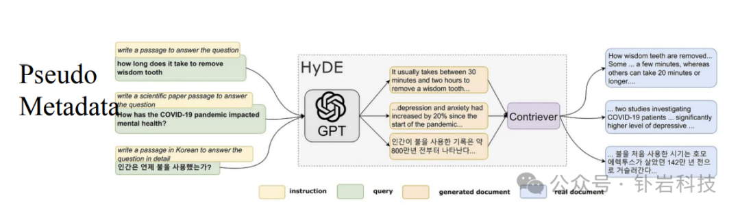 伪metadata方法,也就是HyDE,y将用户的原始查询转换为一个或多个假设性文档。这些文档是针对查询构建的文本片段,它们包含了可能回答查询所需的信息,然后用这些文档计算embedding,从真实文档库检索真实的文档,识别出与原始查询最相关的文档,检索到的真实文档被用作生成响应的上下文信息,可以辅助语言模型生成更准确、更相关的回答。
