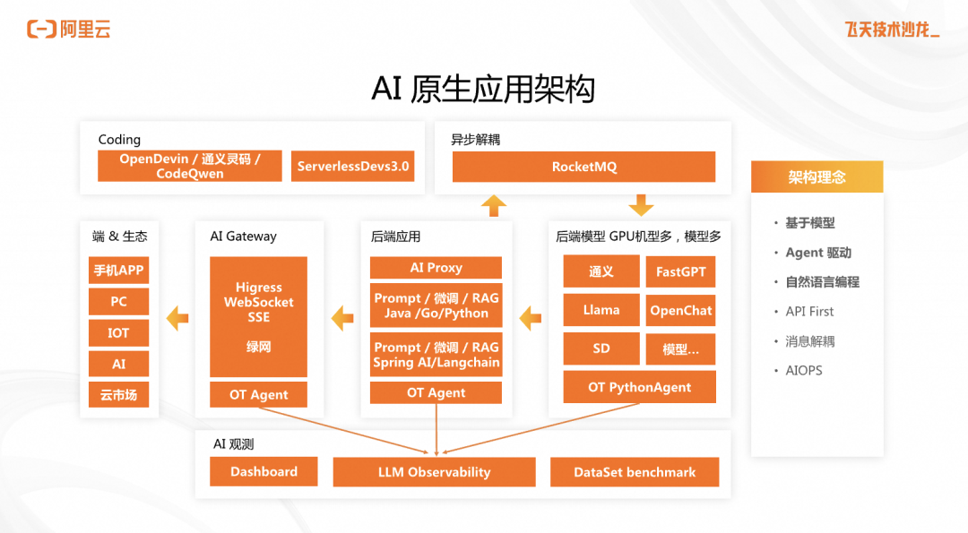 以模型为核心、Agent 进行驱动、面对自然语言编程为 AI 原生应用架构的核心要素,“API First”、“Agent 编排”、“消息解耦”、“AIOps”是架构 AI 原生应用的核心理念。