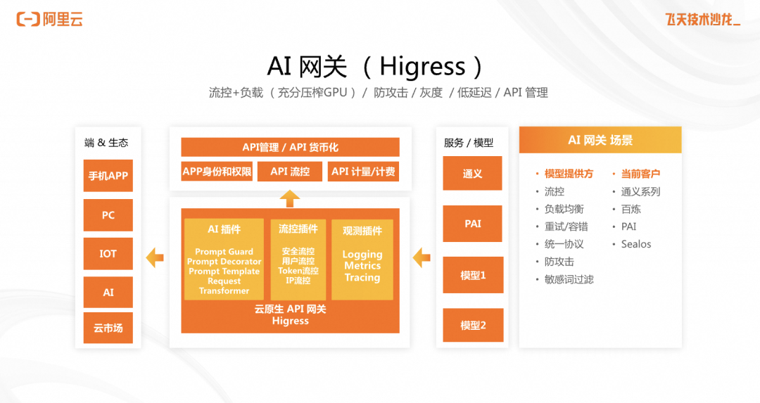 第一类需求,以 Sealos 为例,他优先调用的是 GPT,次选是通义,使用 Higress 网关就可以在 GPT 调用失败的时候实现容错,来调用通义。第二个需求,很多大型企业主账号接入了大模型,给每个员工开通一个使用的子账号,并可以对每个子账号开放或屏蔽模型类型进行自由选择,同时提供体验一致、高可用的服务,这个就是通过 Higress 网关的统一身份的能力来实现的。