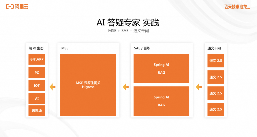 这个架构图里,我们入口网关选择的 MSE 云原生网关,在入口建立安全、高可用的防线,解决一些敏感词过滤的问题,然后在应用管理这层是选择了 SAE,他是免运维的,后端接的是通义2.5的大模型。所以总的来看,构建应用的代码少了、构建应用需要的人力少了,整个开发运维效率都提升了,然后大模型的调用成本在不断下降,能力在不断演进,我的应用可以持续享受用户体验提升的红利。整个过程的感受是非常震撼的。因此,我认为从云原生架构到 AI 原生架构的演进,会持续加速。