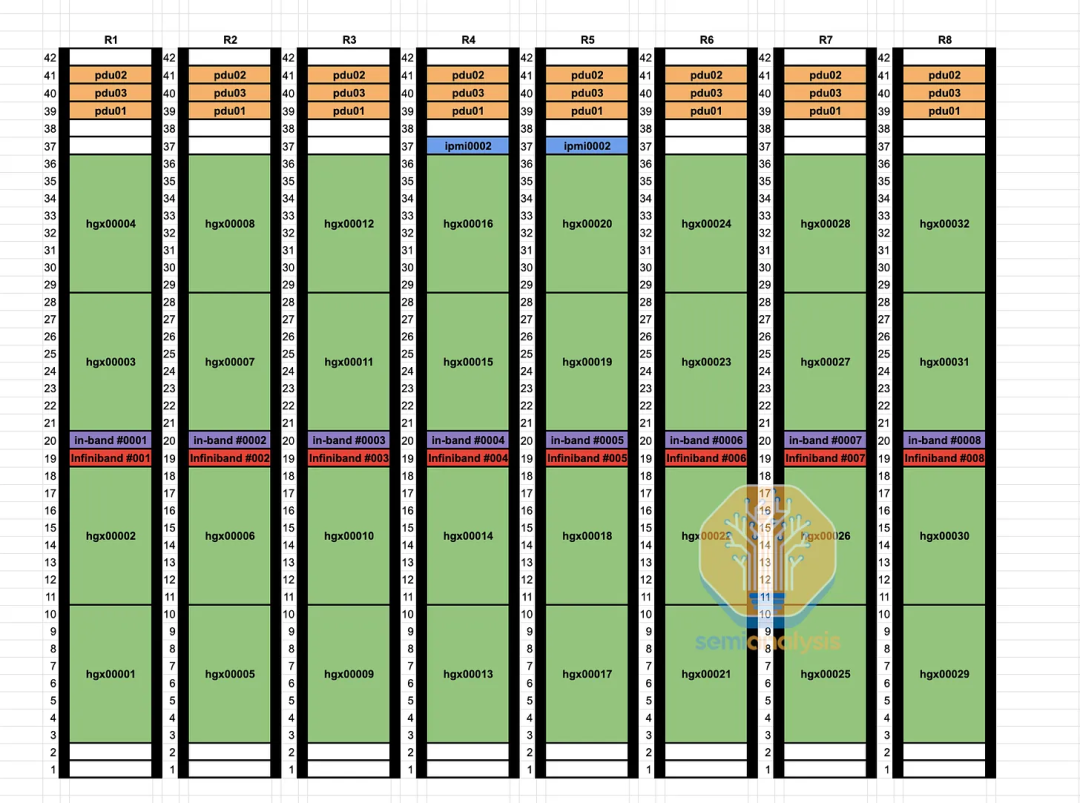 此外,对于数据中心技术人员来说,轨道优化设计的初始布线非常耗时,因为每个链接的末端高达50米远,不在同一个机架上。与机架中部设计相比,您在机架中部有叶交换机,就像连接到叶交换机的所有GPU一样。在机架中部设计中,您甚至可以在集成工厂测试计算节点到叶交换机的链接,因为它们都在同一个机架内。