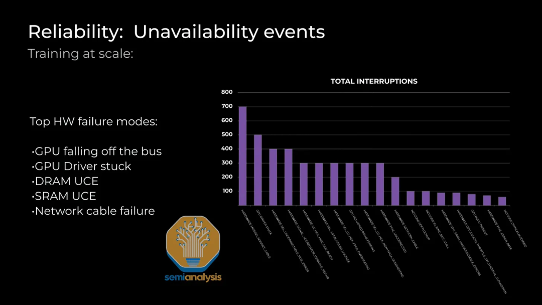 可靠性是这些大型集群最重要的运营问题之一,由于当前前沿训练技术的同步性质。最常见的可靠性问题是GPU HBM ECC错误、GPU驱动程序卡住、光器件故障、NIC过热等。节点不断下线或出现错误。