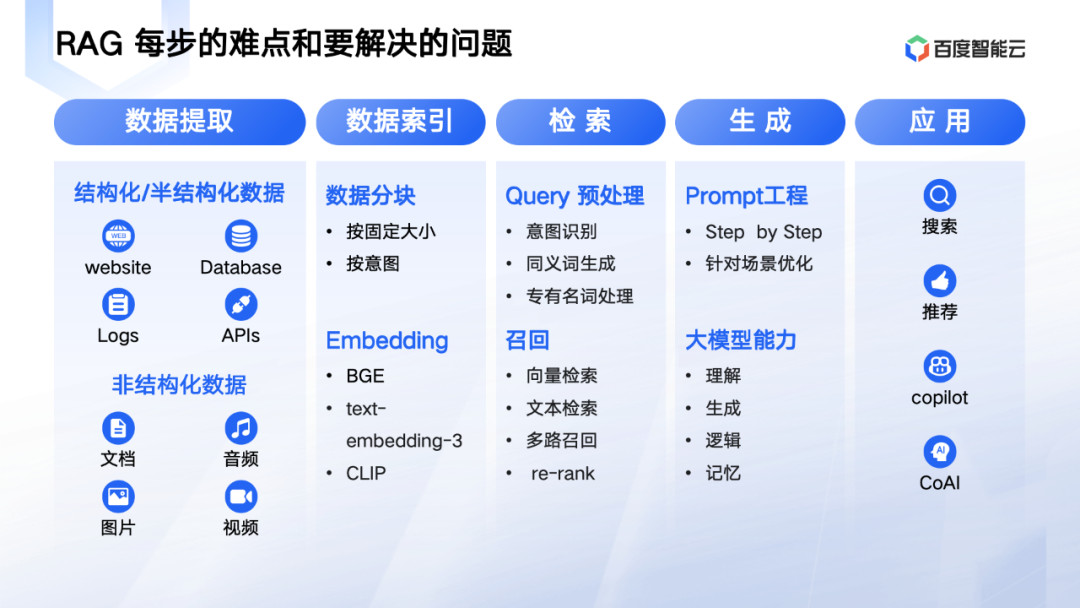 所以大家会看到要把 RAG 作为大模型应用目前主要落地场景,但还是有非常多改进的空间的,这方面的创业公司也很多,技术发展也很快,机会很多。现在典型的 RAG框架有 dify,FastGPT ,百度智能云的 App builder等,大家都可以去试一试。