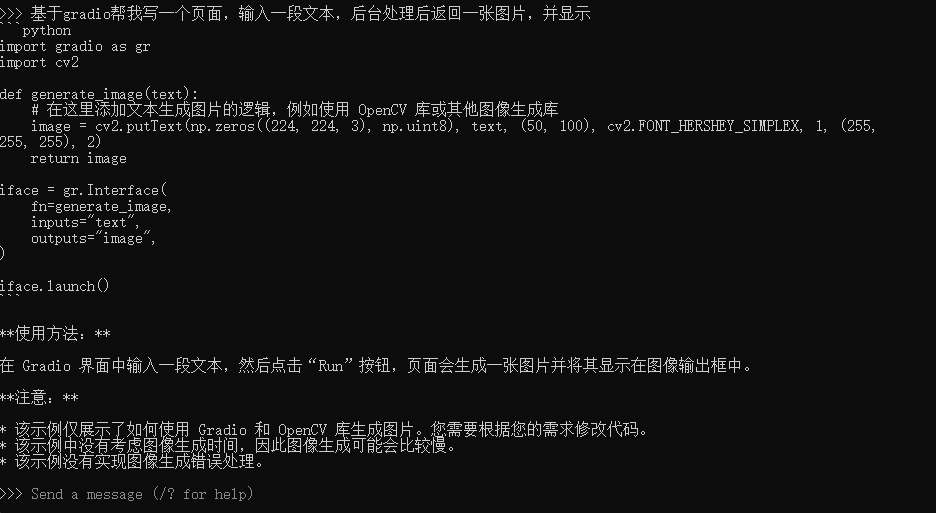 * 该示例仅展示了如何使用 Gradio 和 OpenCV 库生成图片。您需要根据您的需求修改代码。* 该示例中没有考虑图像生成时间,因此图像生成可能会比较慢。* 该示例没有实现图像生成错误处理。