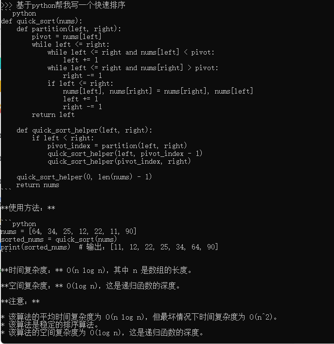 ```pythonnums = [64, 34, 25, 12, 22, 11, 90]sorted_nums = quick_sort(nums)print(sorted_nums)# 输出:[11, 12, 22, 25, 34, 64, 90]```