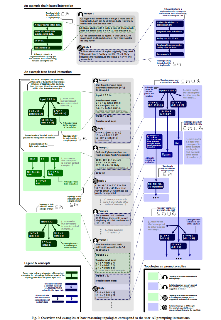 利用拓扑的 LLM 推理的表述方式与第 3 节中描述的完全相同。但是,必须考虑到通用情况下提示,回复和上下文的事实,它们都包含思维及其依赖关系。现在,拓扑映射到、和的确切方式取决于特定的提示方案。例如,在 CoT 的第 i 个提示交互中,推理拓扑T是 LLM 回复(当 T 是解决方案拓扑时)或作为用户提示中上下文示例的子集(当 T 是上下文示例的拓扑时)。然而,在许多基于树和图的方案中,这种映射并不那么简单,并且拓扑可以跨越多个提示和回复。我们在图 3 中说明了这些示例。