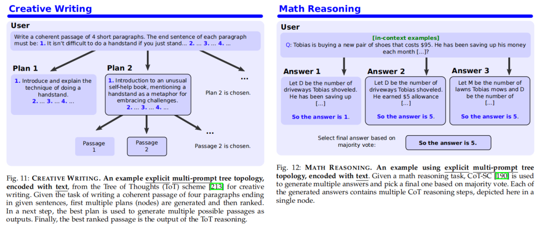 接下来,我们将细致探究采用树形结构的各种策略,这些策略的概览见表1的中部,并在附录中对每个独立方案给予了详尽阐释。我们的探讨围绕着采用的不同树形变体——链式树、1-level树和k-ary树——展开,具体视觉呈现可参考图9。如同链式模型,树形策略同样重视基本概念的引入与应用。核心在于,树形结构促进了思维的衍生(即从既定思路繁衍出多种思路),其目的主要聚焦于任务拆分(与连贯思维(CoT)相似,但拆分不仅限于单一的线性路径)和采样(提高获得高质量解决方案的概率)。此外,树状模型还采纳了投票机制(自动甄选最优输出),并借鉴了链式模型中的架构理念,如迭代细化和任务前期处理。本节通过对比分析及示例图解来收尾。