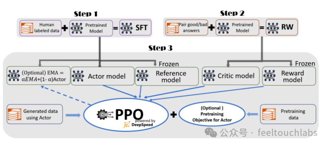DeepSpeed-Chat是微软于2023 年4月发布的基于DeepSpeed 用于训练类ChatGPT 模型的开发工具。 基于DeepSpeed-Chat 训练类ChatGPT 对话模型的步骤框架如图所示,包含以下三个步骤。 (1)有监督微调(SFT) (2)奖励模型微调 (3)RLHF 训练