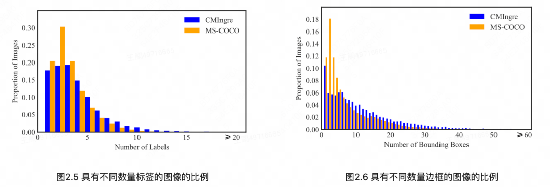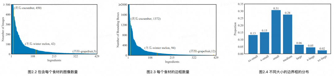 综上所述,清理后的数据集包括8,001张图像,95,290个边界框和429个食材标签。| 2.3 数据统计和分析在CMIngre中,有1,719对来自菜肴的图像-文本,2,330对来自食谱,3,952对来自UGC。如2.1所述,UGC的图像质量比菜肴和食谱的图像质量差,这给我们在接下来的食物理解任务中处理低质量数据带来了更多的工作量,因为UGC覆盖了近一半的数据集。 数据集中每个食材上的图像数量如图2.2所示,少量食材在我们的数据集中出现了很多次。例如,“葱–scallion”在1,961张图片中出现次数最多,约占图片总数的24.51%。此外,有138种食材出现在不到10张图片中。例如,只有5张图片包含“西柚–grapefruit”,8张图片包含“桃–Peach”。图2.3显示了我们数据集中每个食材的边界框数量。如图2.3所示,每种食材对应的边界框数量分布与图2.2中包含该食材的图像数量分布大致相似,均为长尾。为了说明边界框尺寸的差异,图2.4给出了不同尺寸边界框的比例。我们观察到小尺寸的边界框(面积比在0.0025 ~ 0.01之间)的比例最大。同时,有超过50%的边界框的面积比小于0.01,说明数据集中有很多小物体。 表2.1显示了与食品相关数据集的统计比较。我们可以看到,现有的食品相关数据集主要集中在食品识别任务上,其目的是识别图像内的食品类别。很少有数据集为食物边界框提供标注,这是由于它们的目标是定位整个菜肴,而不是各种类型的食材。相比之下,Recipe 1M为每个食物图像提供食材标注。然而,由于缺乏对这些细粒度食材的位置标注,它们只能隐式地建模整个食物图像与相应食材之间的关联,从而限制了模型的性能。因此,我们引入了CMIngre,旨在通过食材检测和检索任务增强对中餐的理解。 最后,我们将CMIngre数据集与广泛使用的目标检测数据集COCO进行了比较分析。在在图2.5中,横轴表示每张图像中标签种类的数量(在CMIngre中标签为食材,在COCO中标签为物体),纵轴表示每种图像的比例。很明显,CMIngre图像通常包含更多的对象(在我们的例子中是食材)。具体来说,CMIngre中包含三个以上标签的图像的占比高于MS COCO数据集。这一趋势在边界框的数量上也很明显。如图2.6所示,与MS COCO相比,我们的数据集中超过5个边界框的图像比例更大。综上所述,CMIngre中的图像比其他现有数据集具有更丰富的语义和更密集的边界框,这对图像理解提出了更艰巨的挑战。