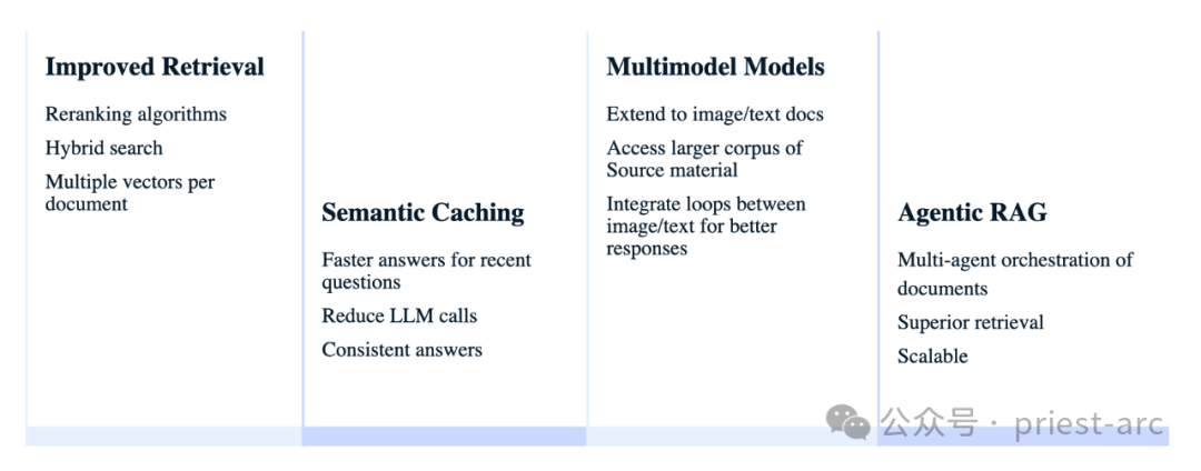 1、RAG -增强检索 此技术的优化对于 RAG 系统的高效表现至关重要。最新的进展侧重于重新排名算法和混合搜索方法,旨在精准完善搜索结果的质量和相关性。其中,通过为每个文档构建多个矢量表示,可以实现更加细粒度的内容表征,从而增强相关性识别的准确性,确保检索到的信息与查询需求高度贴合。 2、语义缓存(Semantic Caching) 语义缓存(Semantic Caching)的引入成为降低计算成本、确保响应一致性的关键策略。通过将最近查询的答案与其语义上下文一并存储,RAG 系统可以高效地解决类似的请求,而无需重复进行计算密集型的 LLM 调用,从而大幅提升响应时间,并确保信息传递的一致性。 3、多模态集成(Multimodal Integration) 多模态集成(Multimodal Integration)技术将 LLM 和 RAG 的能力拓展到了文本之外的更广阔领域。通过集成图像、视频等其他模态数据,RAG 系统可以访问更加广泛的源材料,实现文本和视觉数据之间的无缝交互。这不仅有助于系统产生更加彻底和细致的响应,还为未来实现多模态信息处理及跨模态推理奠定了坚实基础。 4、Agentic Enhancement(代理增强技术) Agentic Enhancement(代理增强技术)的应用赋予了 LLM 和 RAG 前所未有的智能化能力。通过引入基于人工智能的智能代理,这些系统不再是被动响应查询请求,而是能够主动分析任务复杂性、评估当前信息状态,并战略性地选择最有效的工具和方法进行多步骤的数据检索和处理。