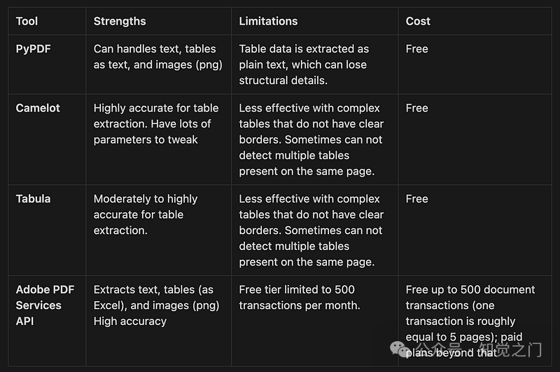 不同工具的比较在考虑选择哪种选项来解析 PDF 文档时,PyPDF 是基本提取需求的理想选择,在这些需求中,表格结构可能不是优先事项。它是完全免费的,适合预算紧张且需要简单解决方案以高精度提取文本和图像的用户。根据我的经验,大多数情况下,将表格格式保留为文本是可以接受的。 Camelot 和 Tabula 专为表格提取而设计,最适合需要提取表格数据的场景。它们也是完全免费的,在我看来,如果您对偶尔的不准确性没有意见,那么它们就足够好了。 Adobe PDF Services API 为企业或应用程序提供了一个非常强大的解决方案,在这些企业或应用程序中,文本、表格和图像提取的高精度至关重要。但是,没有关于 API 定价的明确信息。这里说您需要联系销售人员获取报价。在这个主题上,Adobe Extract API 似乎相当昂贵。实际上,我** **愿意为实际使用付费,因为提取的输出质量是优质的!